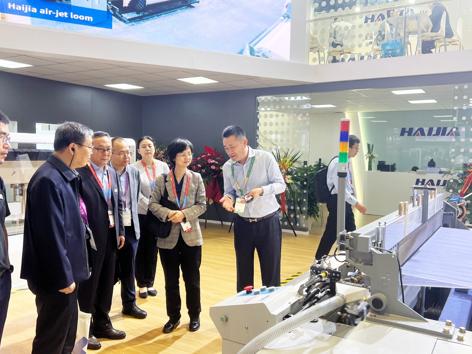 工業(yè)和信息化部消費(fèi)品工業(yè)司副司長(zhǎng)鄭艷一行領(lǐng)導(dǎo)參觀海佳展位,董事長(zhǎng)王安儉重點(diǎn)介紹了海佳噴氣織機(jī)創(chuàng)新賣點(diǎn)。